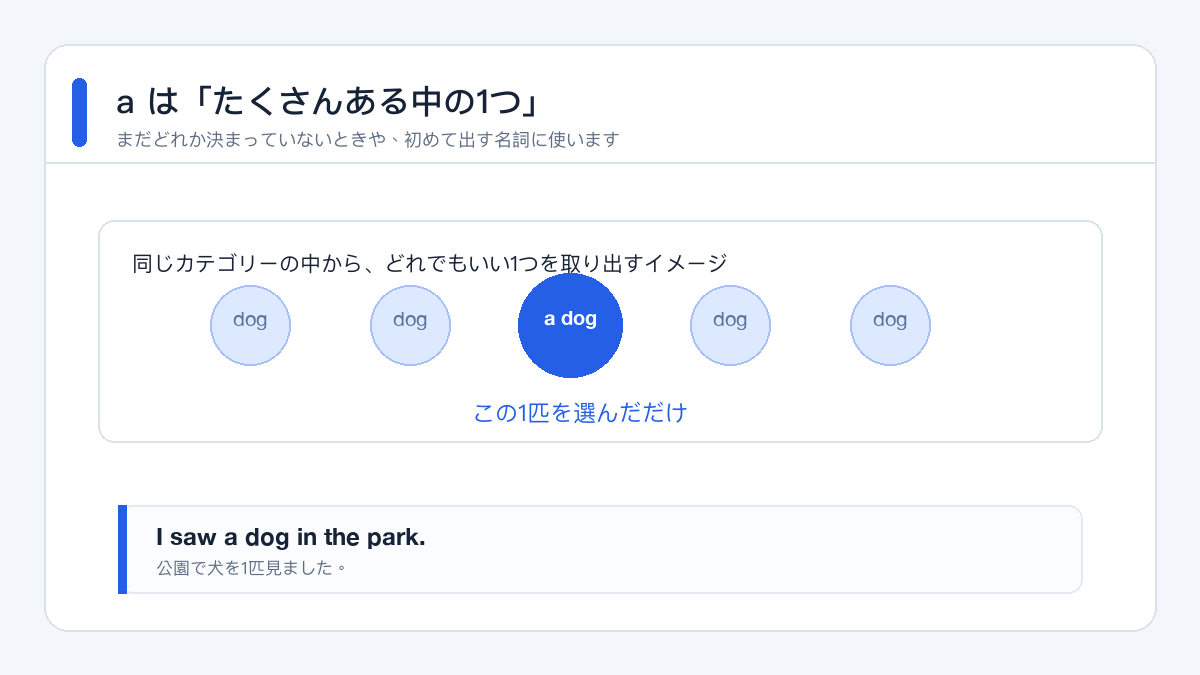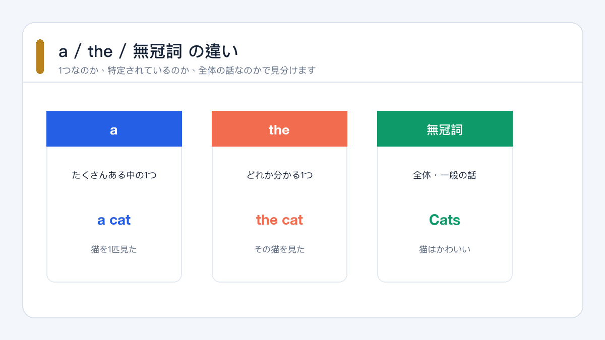 この3つをイメージでつかめば、冠詞の苦手意識はかなり減ります。