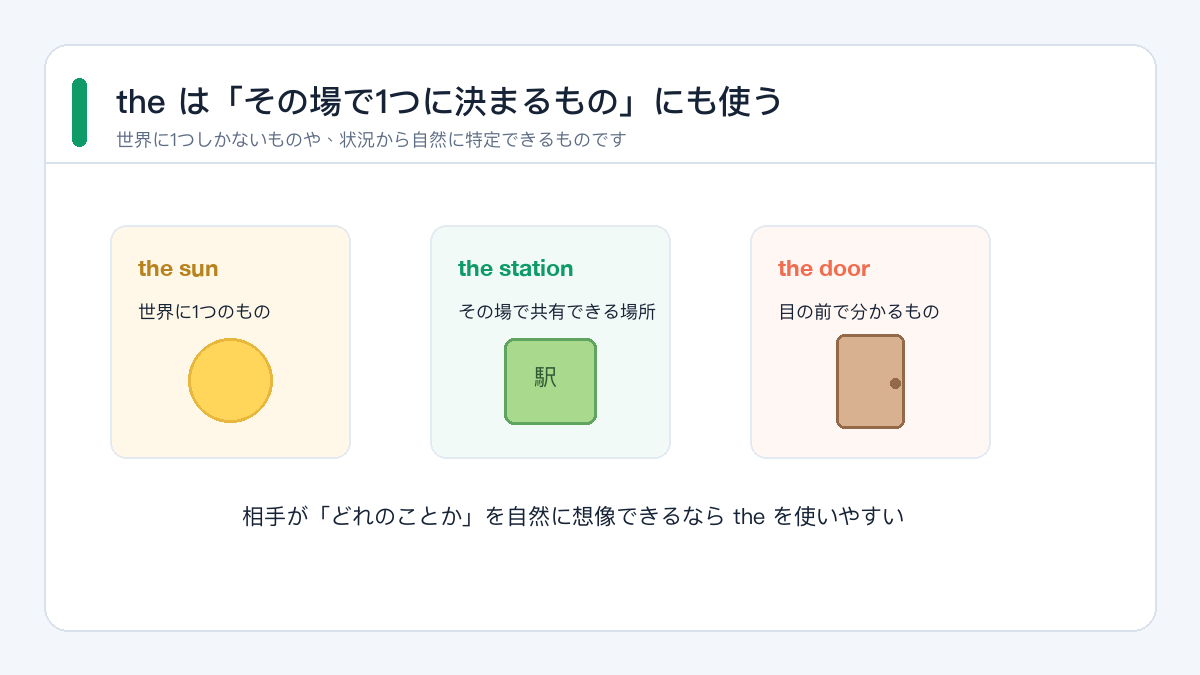 世界に1つしかないものや、その場の状況で1つに決まるものにも theを使います。