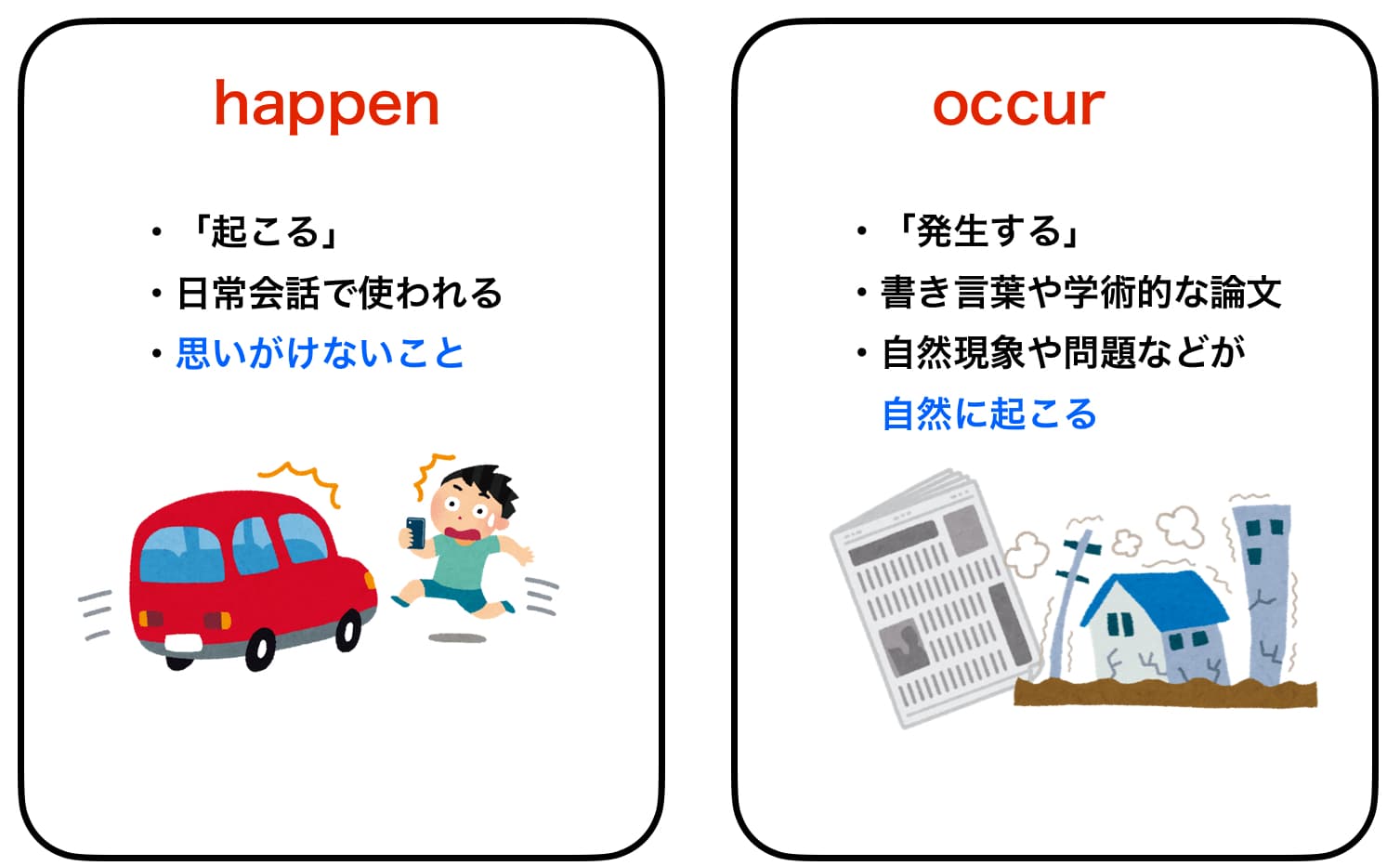 happenは「起こる」という意味で、日常で最もよく使われ、思いがけないことが起こるというニュアンスがある一方、occurは「発生する」という意味で、書き言葉や学術的な文脈でよく使われ、自然現象や問題などが自然に起こるというニュアンスがあるという違いがあるということがわかったかと思います。