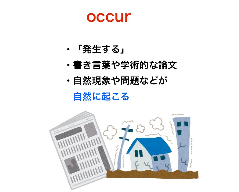 occurは、「発生する」という意味で、書き言葉や学術的な文脈でよく使われ、自然現象や問題などが自然に起こるというニュアンスがあります。
