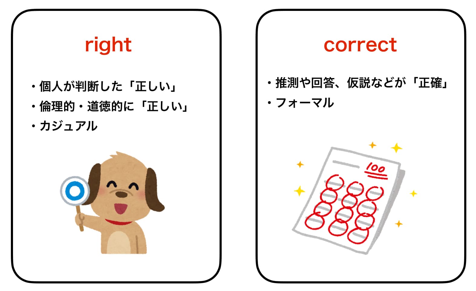 rightは、よりカジュアルな表現で、物事に対して「正しい」と個人が判断するようなニュアンスがある一方、correctは、よりフォーマルな表現で、推測や回答、仮説などが「正確である」というニュアンスがあることがわかったかと思います。