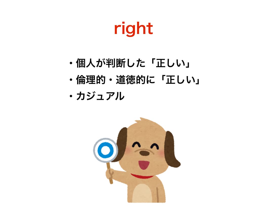 rightは、よりカジュアルな表現で、物事に対して「正しい」と個人が判断するような場合に用いることができます。