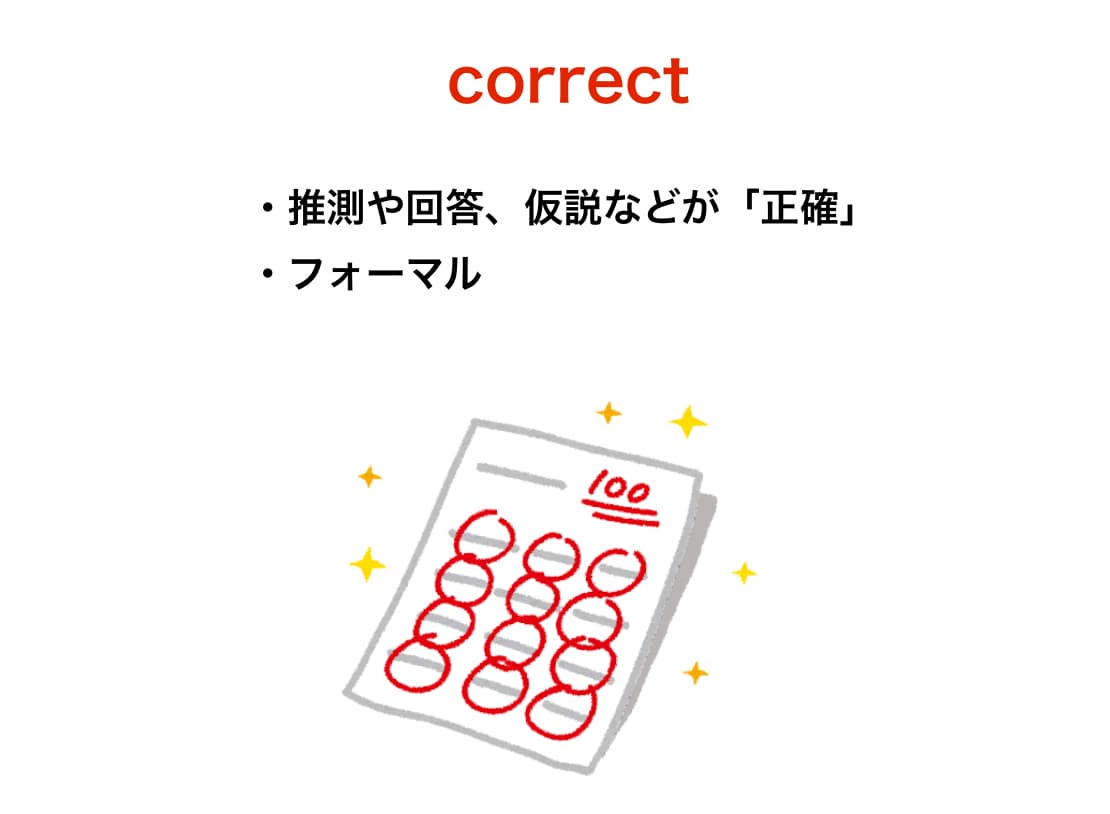 correctは、rightと異なり、“✕ You are correct(あなたは正確だ)”のように「人」に対して使うことはできません。
